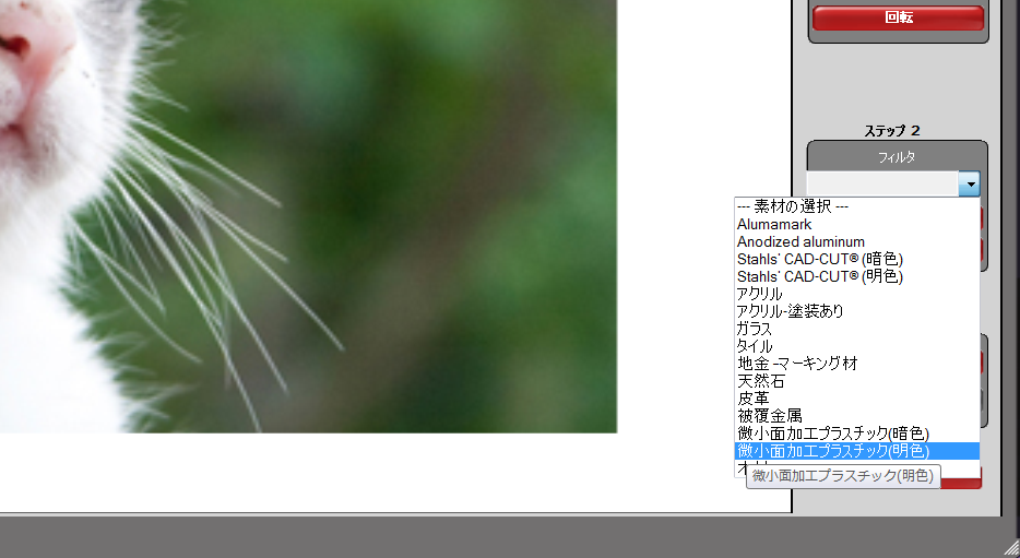 - 効果が適用されたら、ステップ3の【印刷】をクリックしてください。クリックを行うとレーザーの設定画面が表示されますので、加工素材を選択し加工素材の厚みを入力してから【OK】をクリックしてください。※【印刷】ではなく、保存をクリックすると効果が適用された画像をファイルとして保存することが出来ます。このファイルをIllustratorやcorel drawなどの編集ソフトに貼り付けて、通常の手順で加工を行うことも出来ます。ただし、編集ソフト上で画像サイズを変更すると効果が無効になってしましますので、効果適用後の画像サイズの変更は行わないでください。
