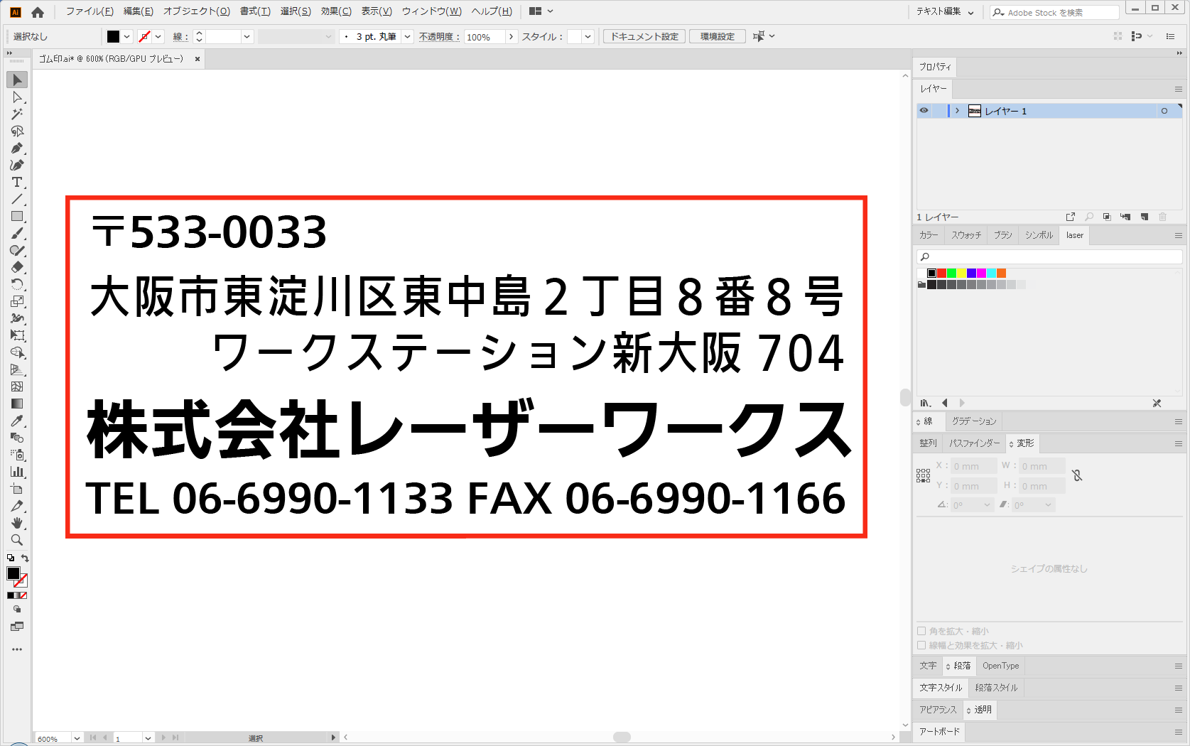 - ゴム印のサイズで赤枠を作成し、その中にゴム印として彫刻する文字を入力します。