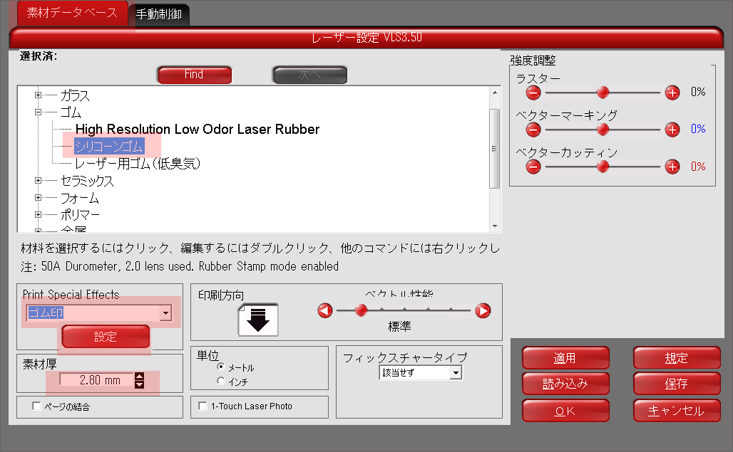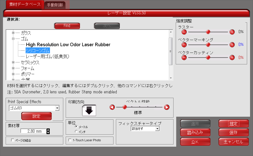 今回は【ゴム】の中にある【シリコーンゴム】を選択しました。そのまま素材厚(ゴムシートの厚み)を入してください。(今回は2.8mm)