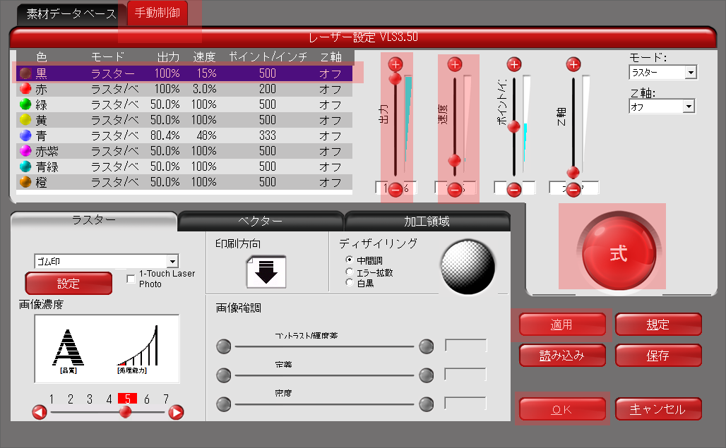 - 手動制御の画面に切り替わったら、黒(彫刻する色)をクリックして、内容の変更を行ってください。終わったら【式】ボタンをクリックして変更内容を確定します。そのまま、右側に並んだボタンの【適用】をクリック、最後に【OK】をクリックしてください。