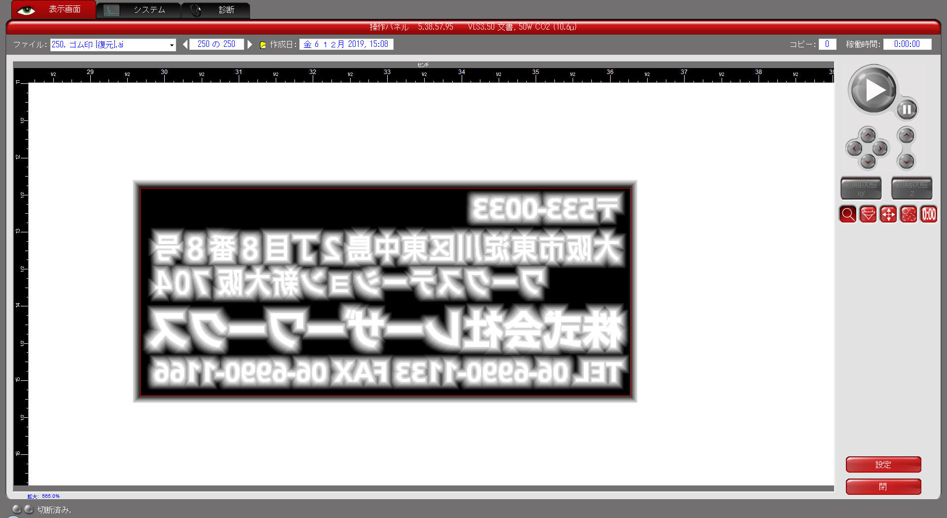 - レーザーのコントロールパネルに加工データが表示されていれば正常です。
