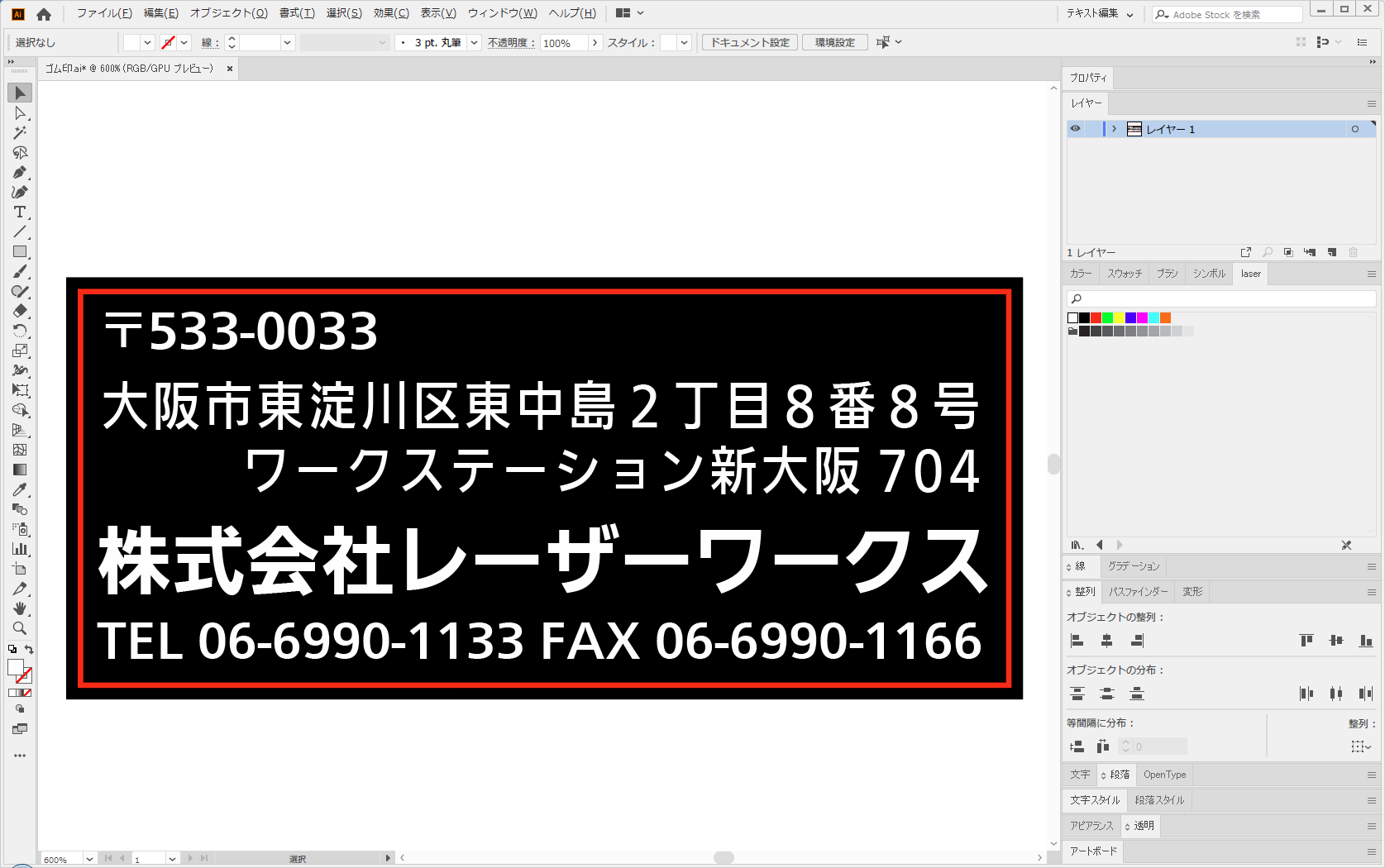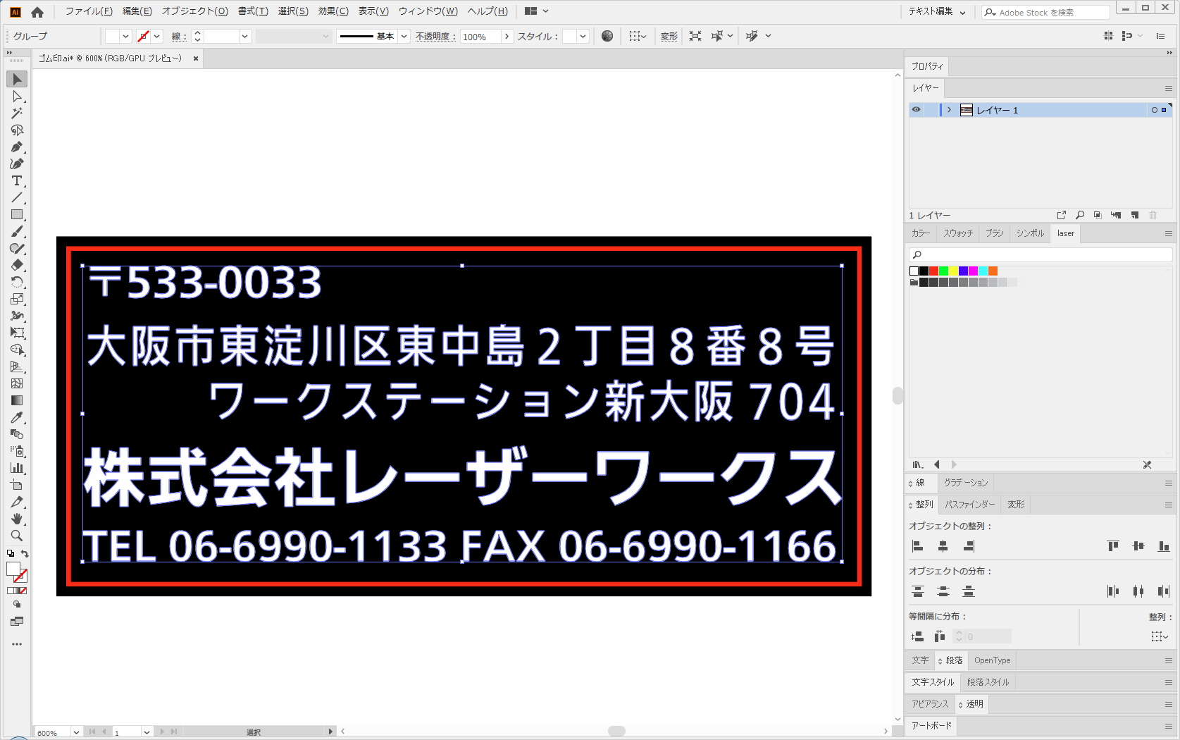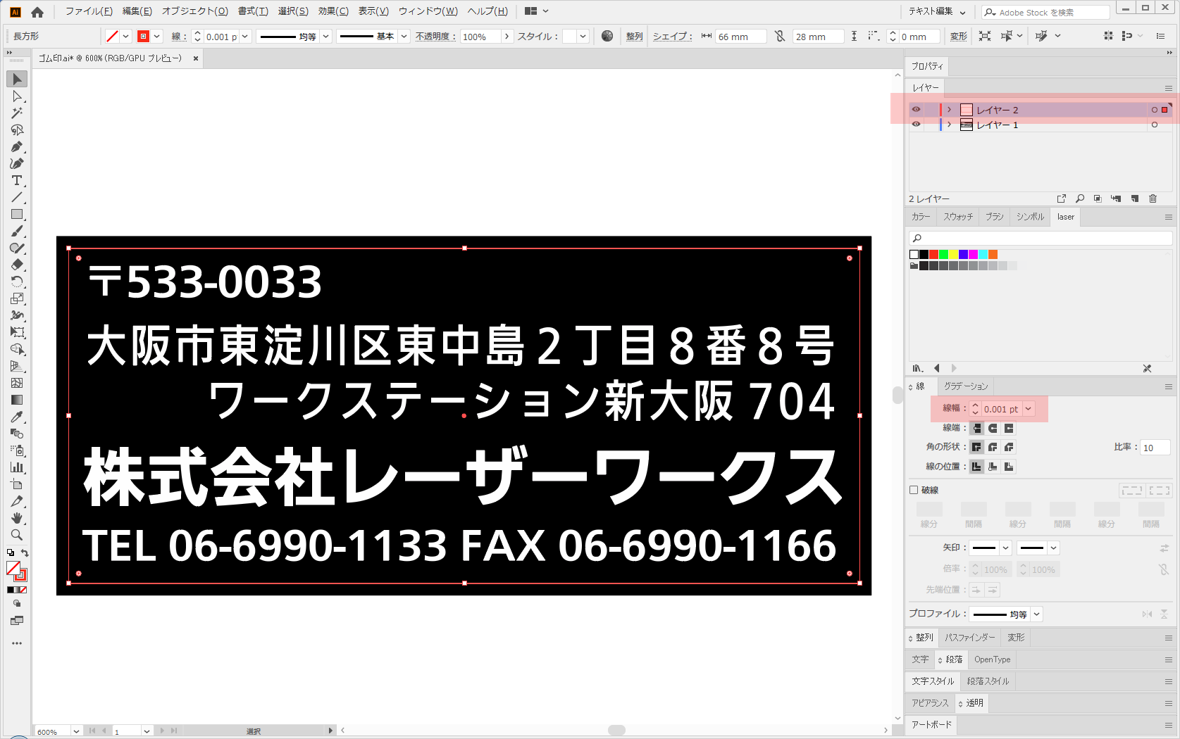 - 赤い線は、後でゴムを切断するために使用します。赤い線を線幅0.01mmに指定し、彫刻と切断を別々に加工できるように、レイヤーを追加し、線を別のレイヤーに移動してください。