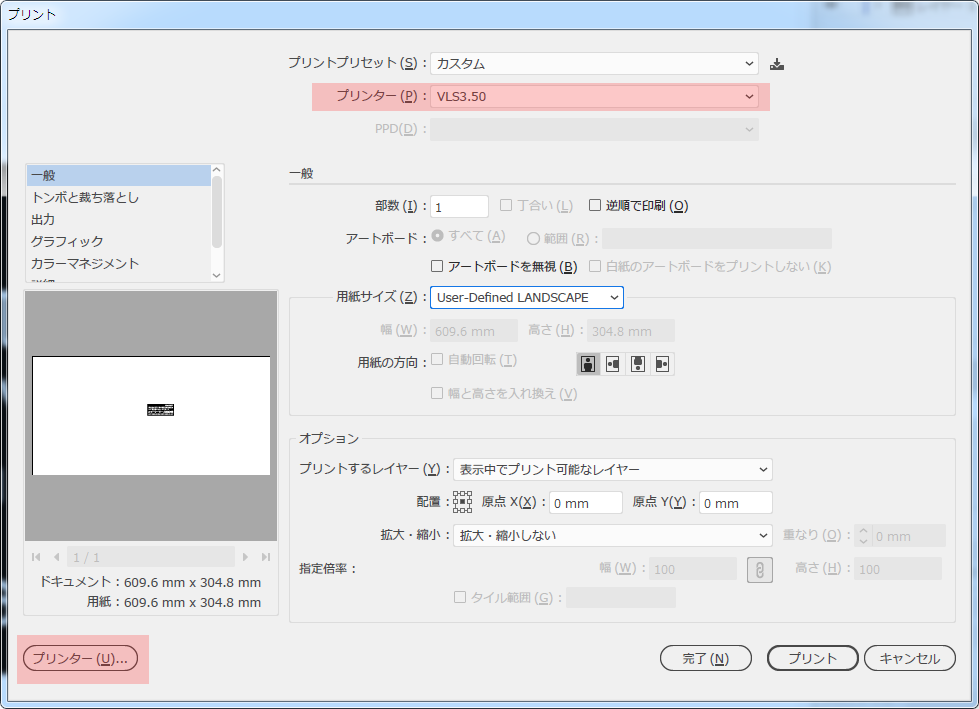 - Illustratorからプリントを行ってください。プリントを行うとプリントダイアログが表示されます。プリンターのドロップダウンメニューでレーザーを指定して、左下のプリンター(U)をクリックします。