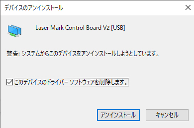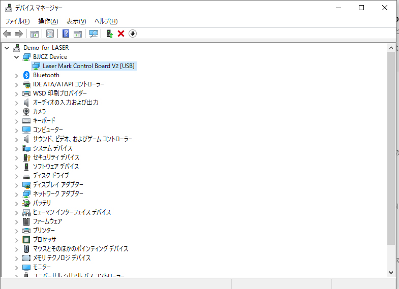 - デバイスマネージャーを起動し、BJJCZ Device-Laser Mark Control Board V2デバイスをアンインストールしてください。