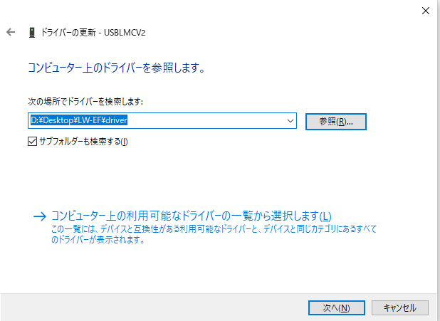 - 任意のフォルダーにコピーされたファイルの中の、driverフォルダを指定します。この時、サブフォルダーも検索するにチェックを入れてください。