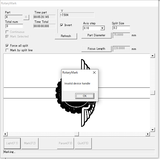 エラーメッセージ Invalid device handle が不定期に頻発する場合は、ソフトとデバイスドライバーを再インストールしてください。
