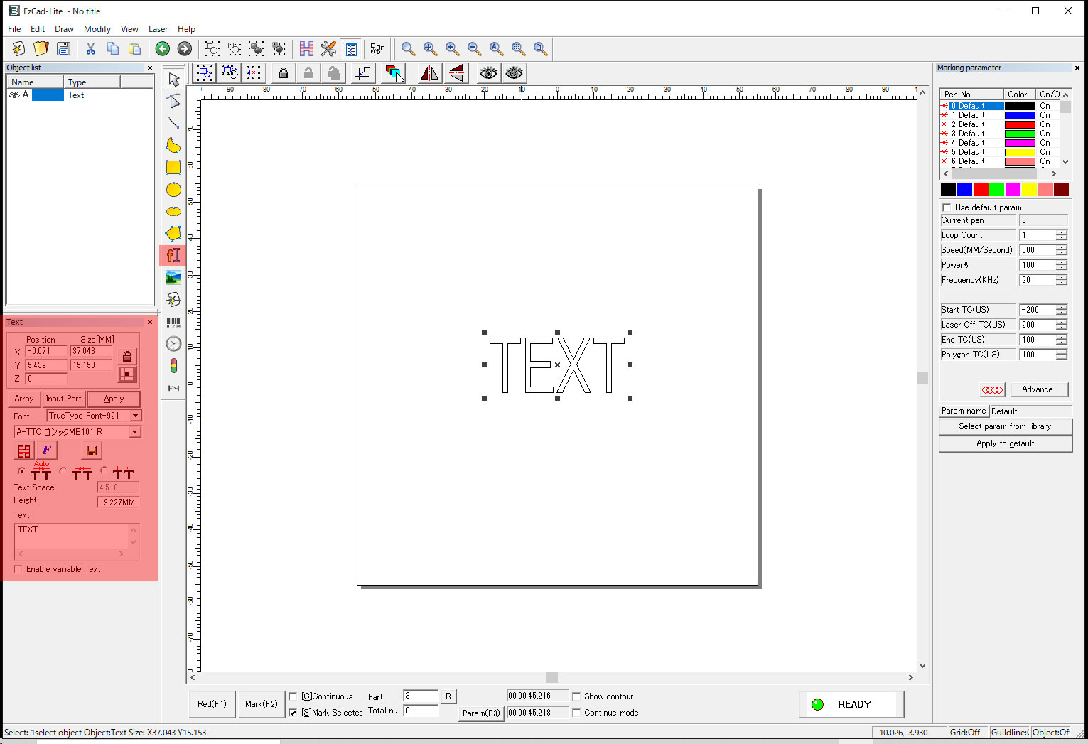 文字入力アイコンをクリックして、画面上の任意の点をクリックすると、”TEXT”という文字が入力され、左側にテキストのプロパティが表示されます。