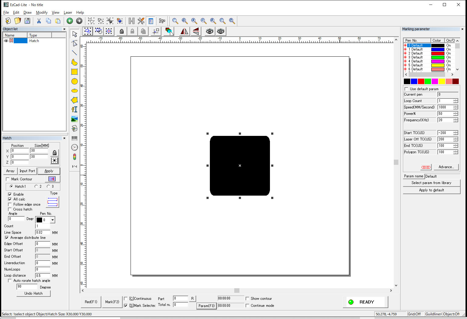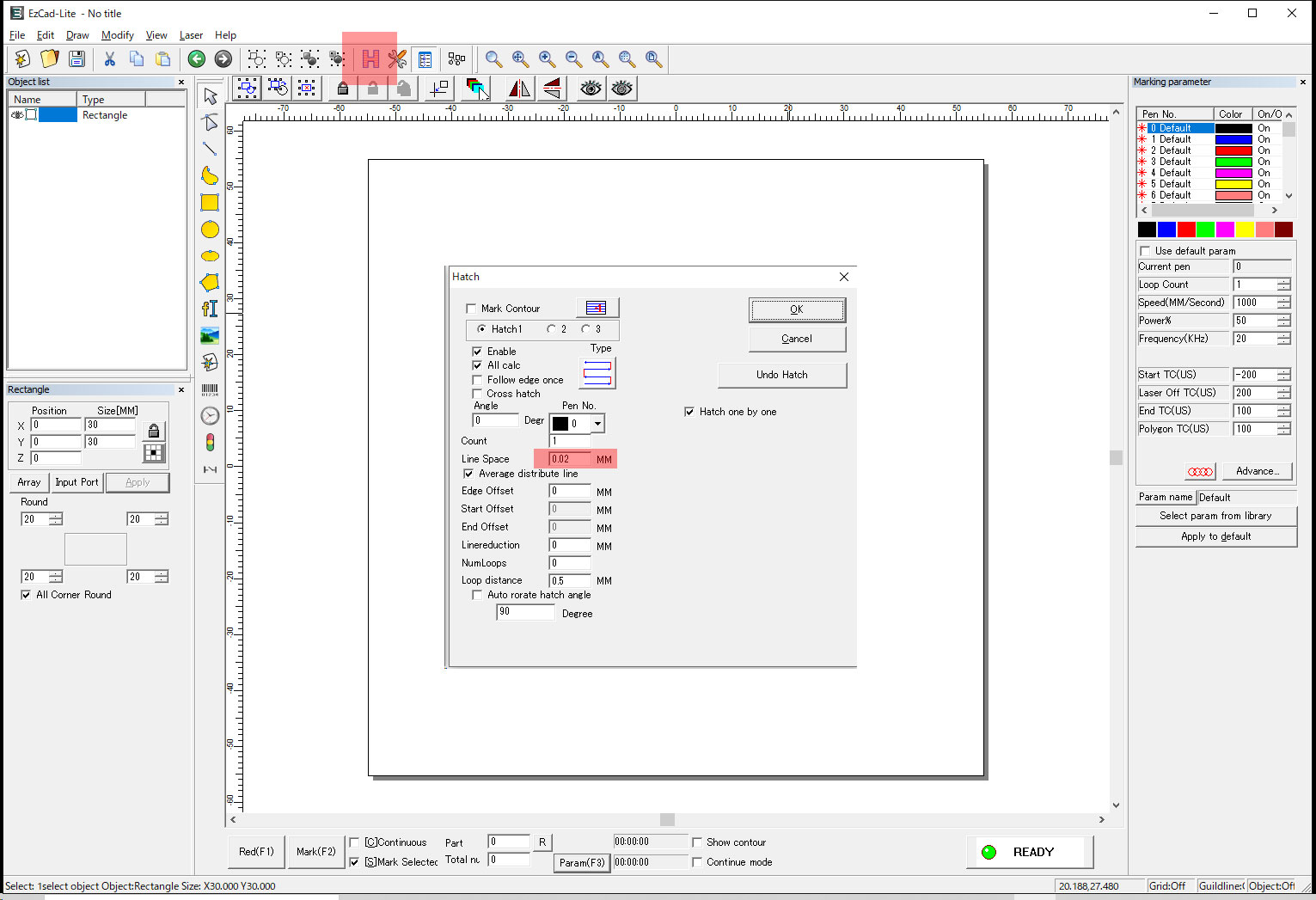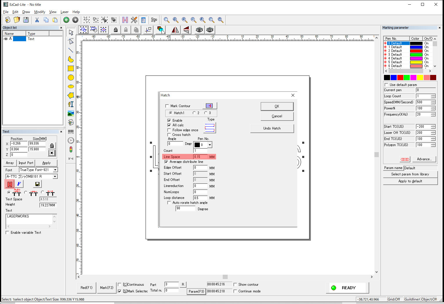 パラメーターにはいくつかの色がありますが、これはレーザーでマーキング出来る色ではありません。ハッチングの際に選択した色ごとにレーザーのパラメーターを変えることが出来るということです。もしも青色でハッチングを行った場合は青のパラメーターを変更しなければなりません。