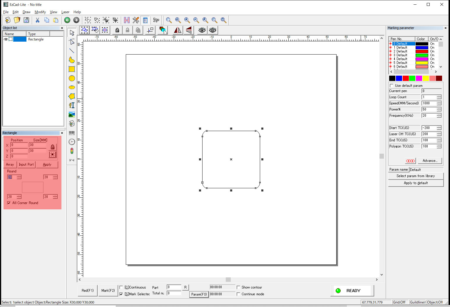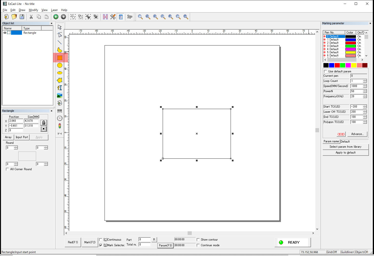 焦点距離を合わせた後、マーキングする図形を選択して、左下のRed(F1)をクリックしてください。赤色プレビューが図形の位置をトレースします。