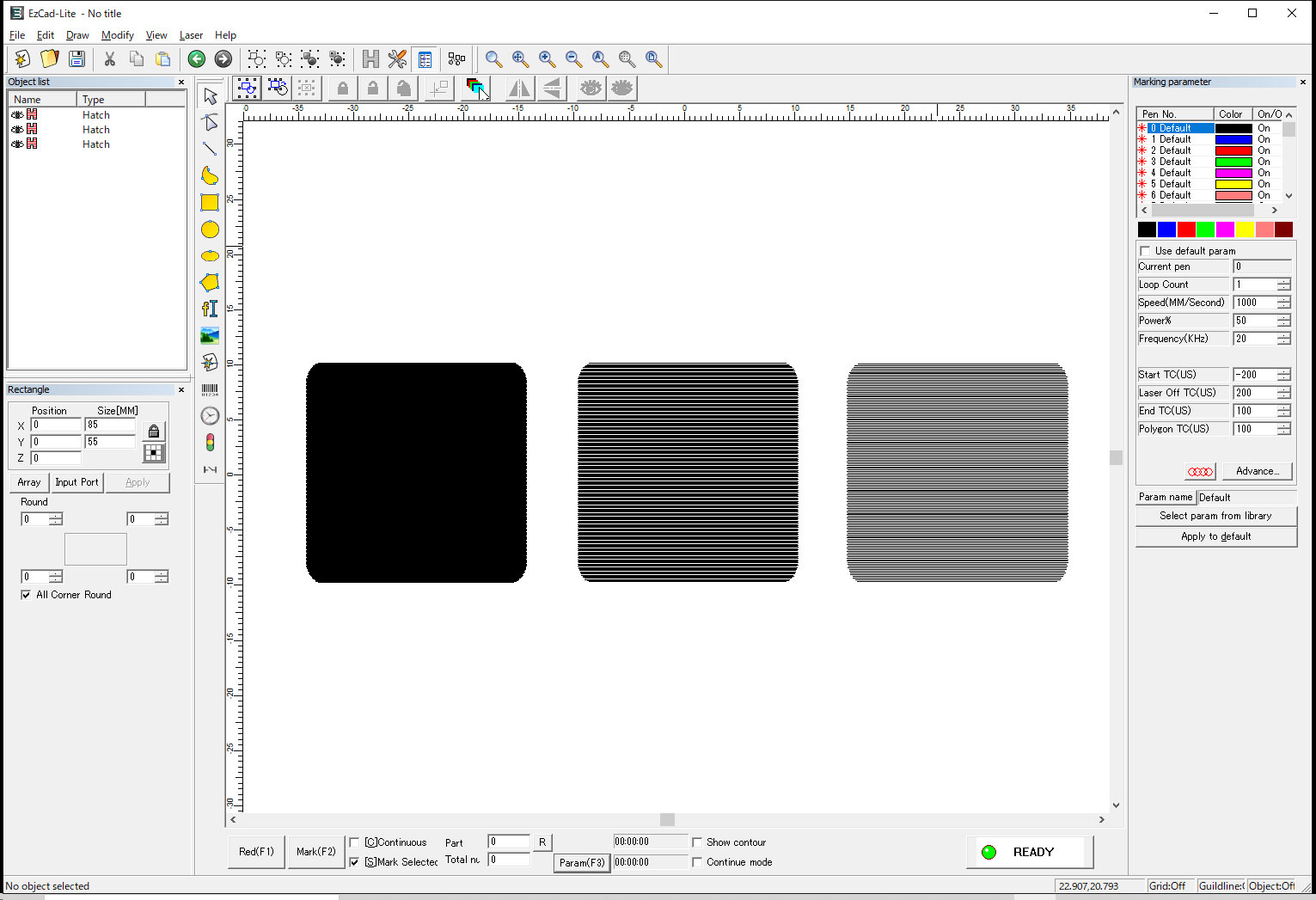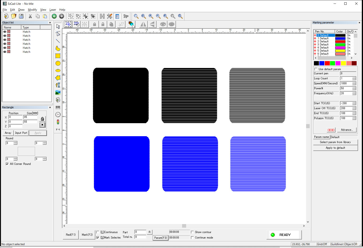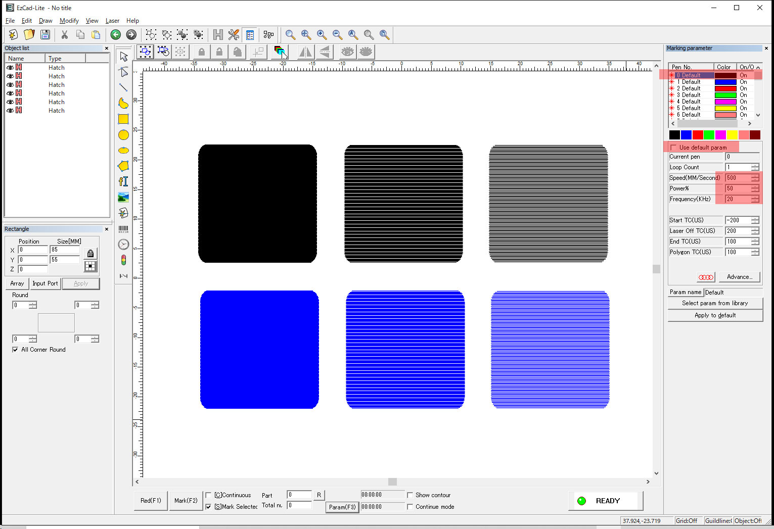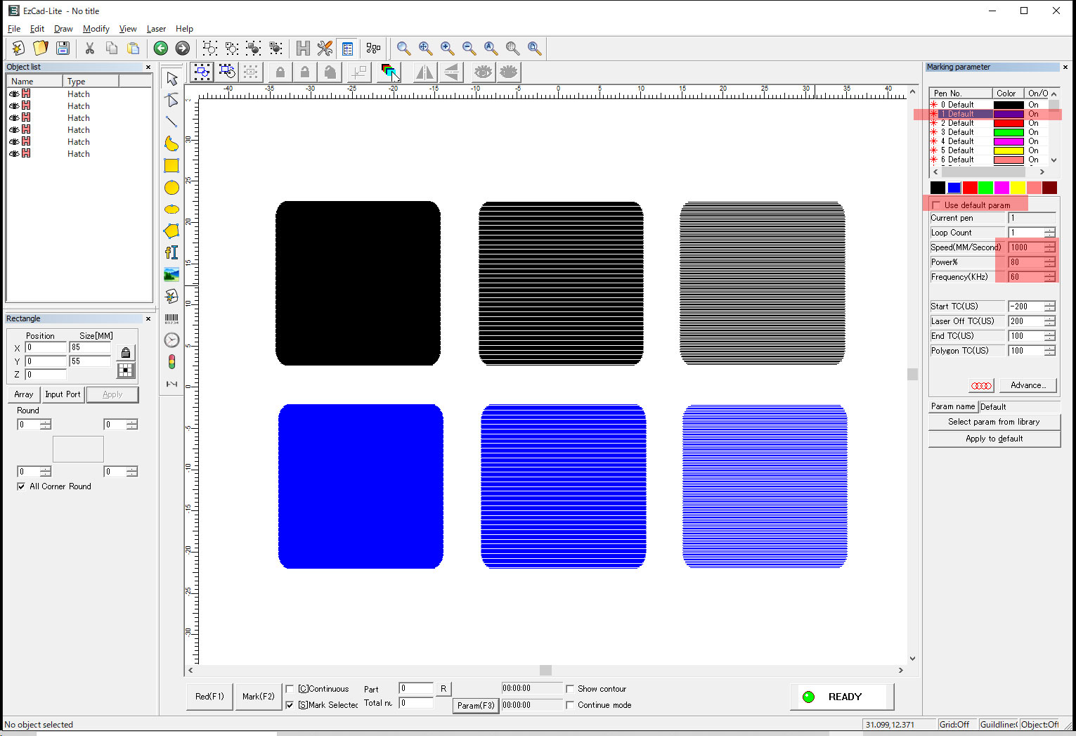 今回の場合、3種類のハッチングを2つのパラメーターでマーキングしますので、合計6種類の異なる設定のマーキングを行うことが出来ます。