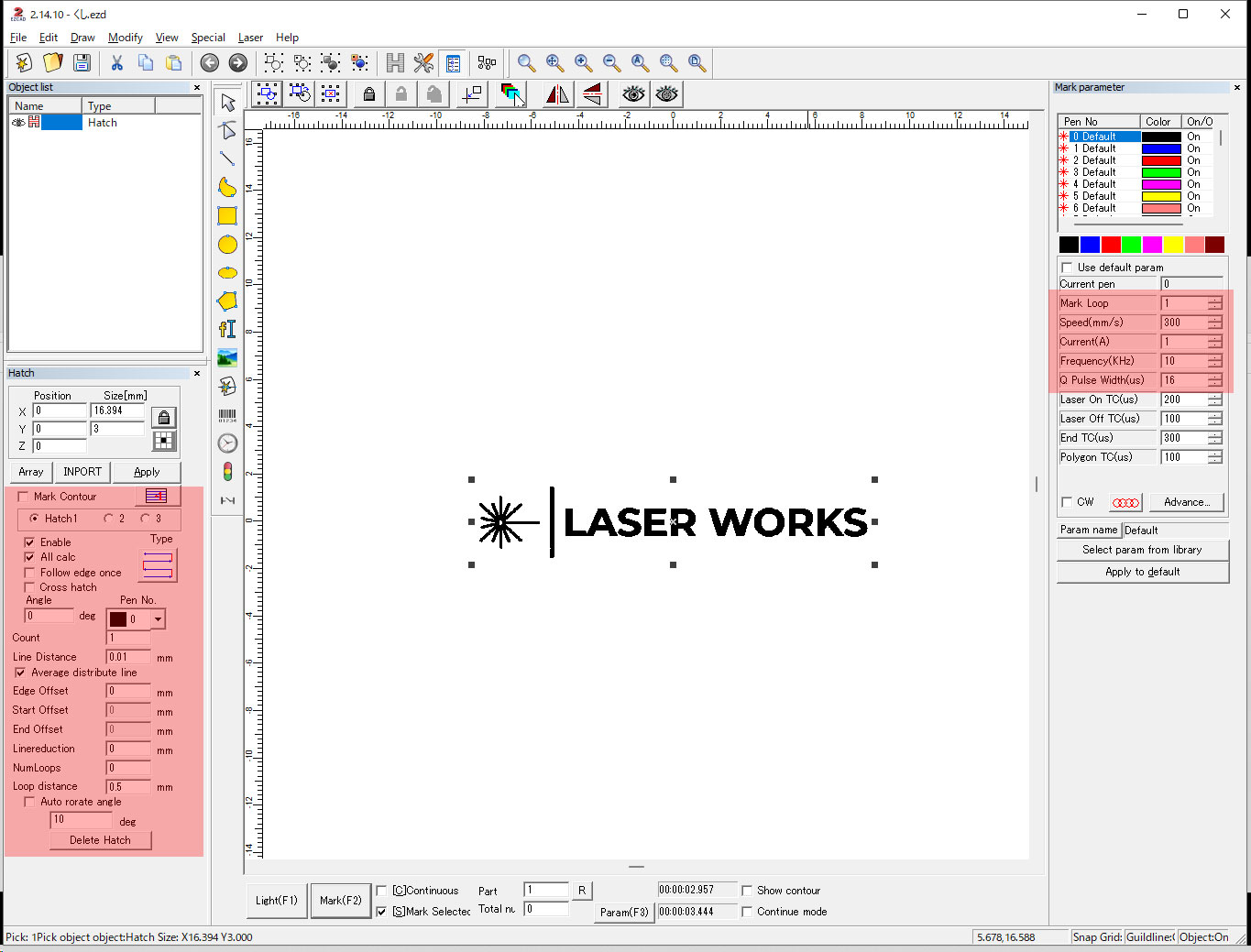加工ブログ レーザーパラメーター ブログ記事『66ナイロン/カーボンのヘアコームにUVレーザーでマーキング』のパラメーター 66ナイロン/カーボンのヘアコームにUVレーザーでマーキング パラーメーター(ハッチング/Speed/Power/Frequency)は画像を参考してください。UVレーザー出力は5Wですので、3Wレーザーの場合は、適宜、出力を変更してください。