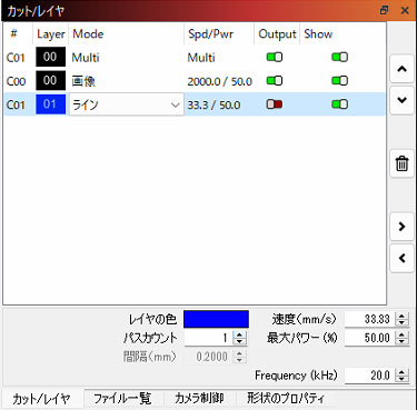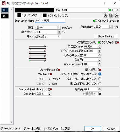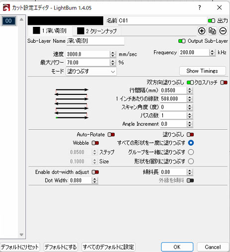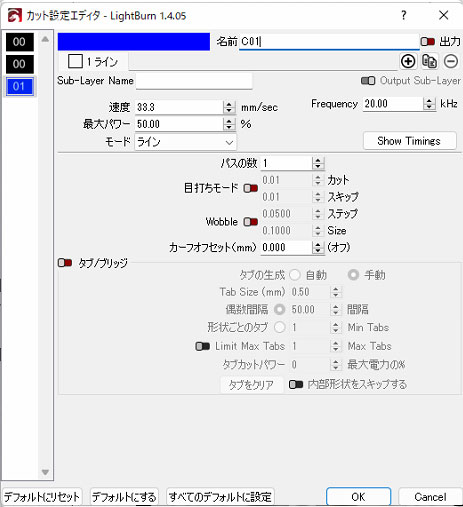 レイヤのデフォルトはマテリアル ライブラリとは別のものであり、この 2 つを一緒に使用すると便利であることがわかります。レイヤー デフォルトの一般的な用途は、自分のプロジェクトに共通のカット設定を使用してレイヤーをセットアップし、マテリアル ライブラリを使用してさまざまなマテリアルやプロセスに設定を適用することです。